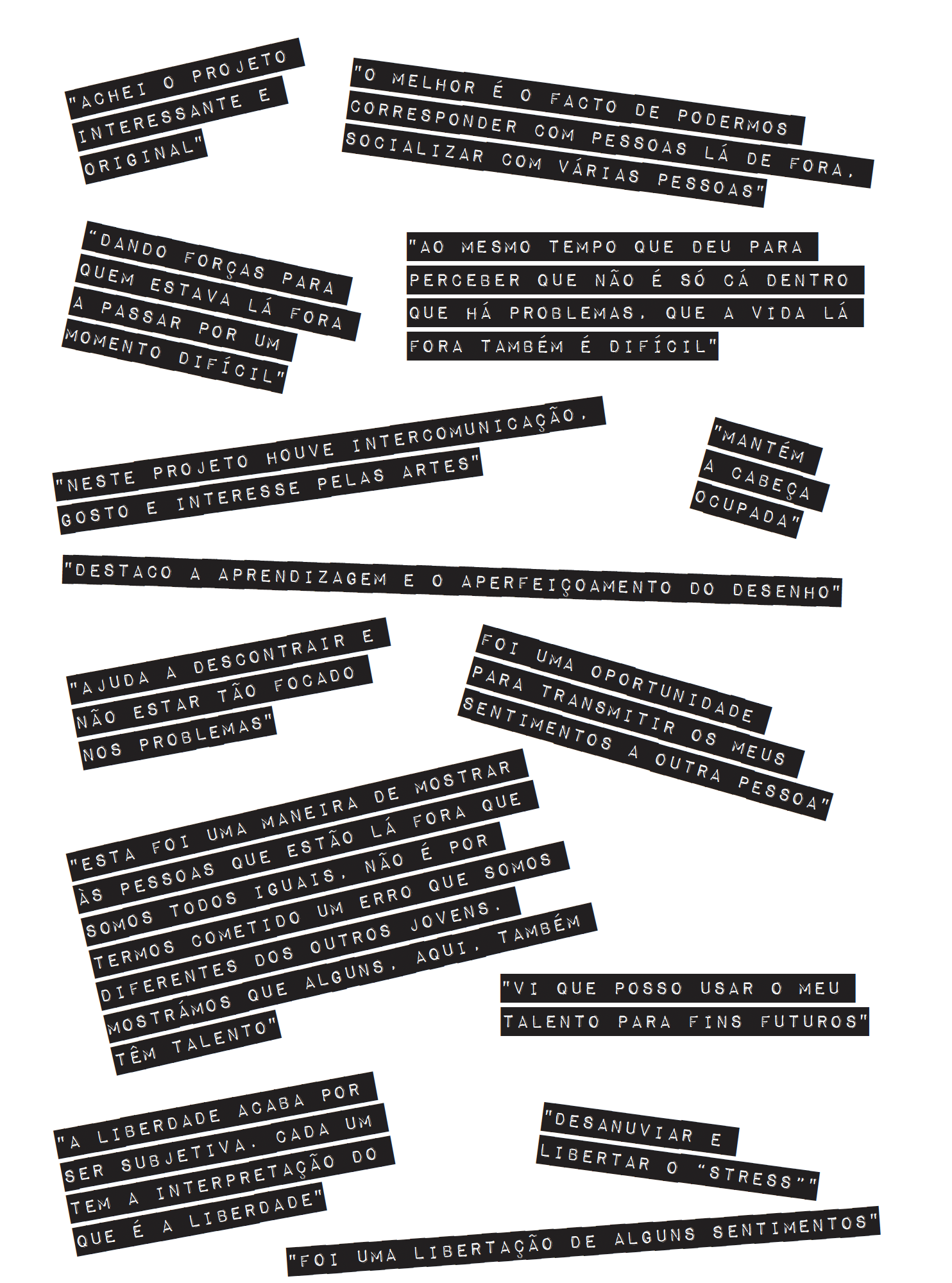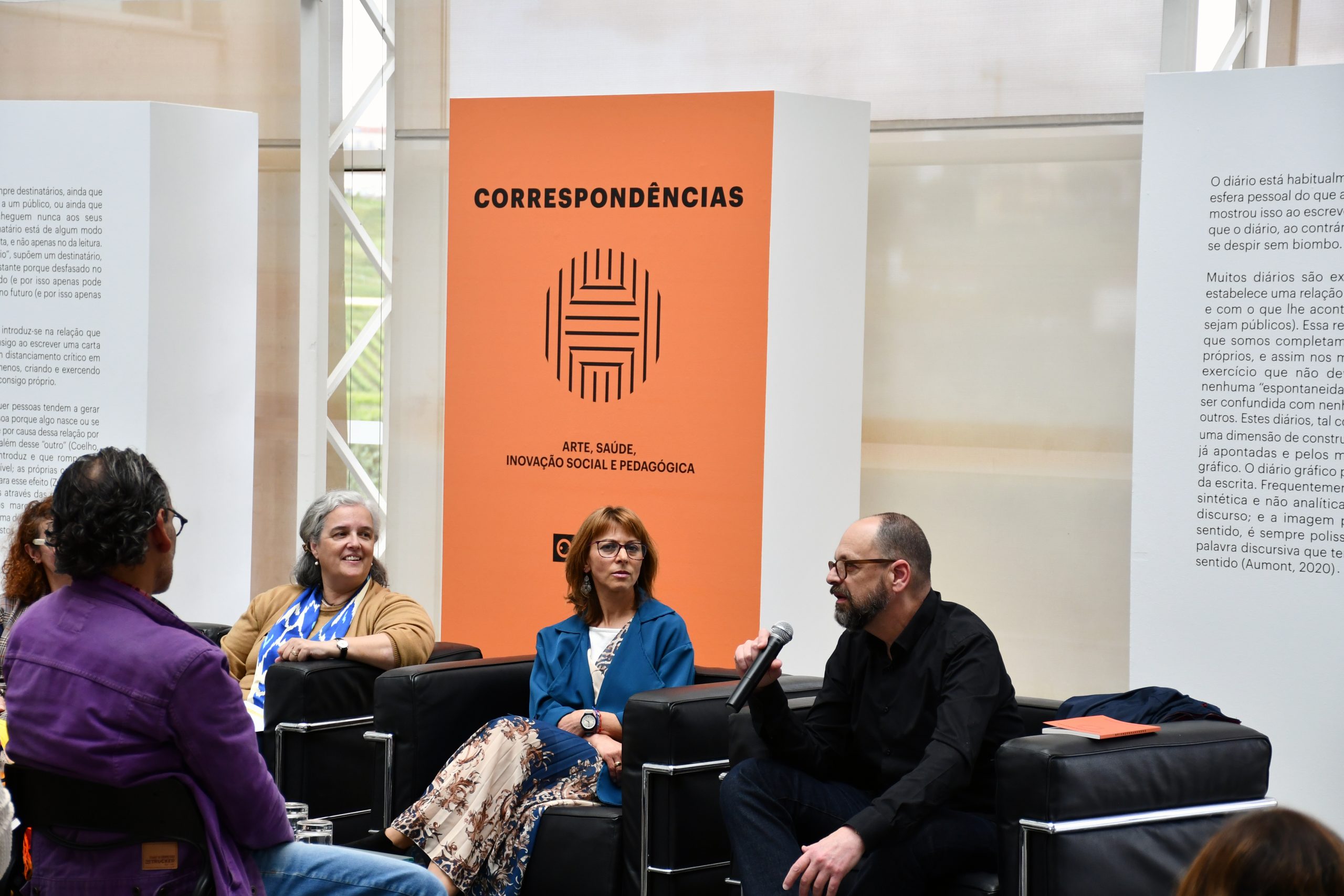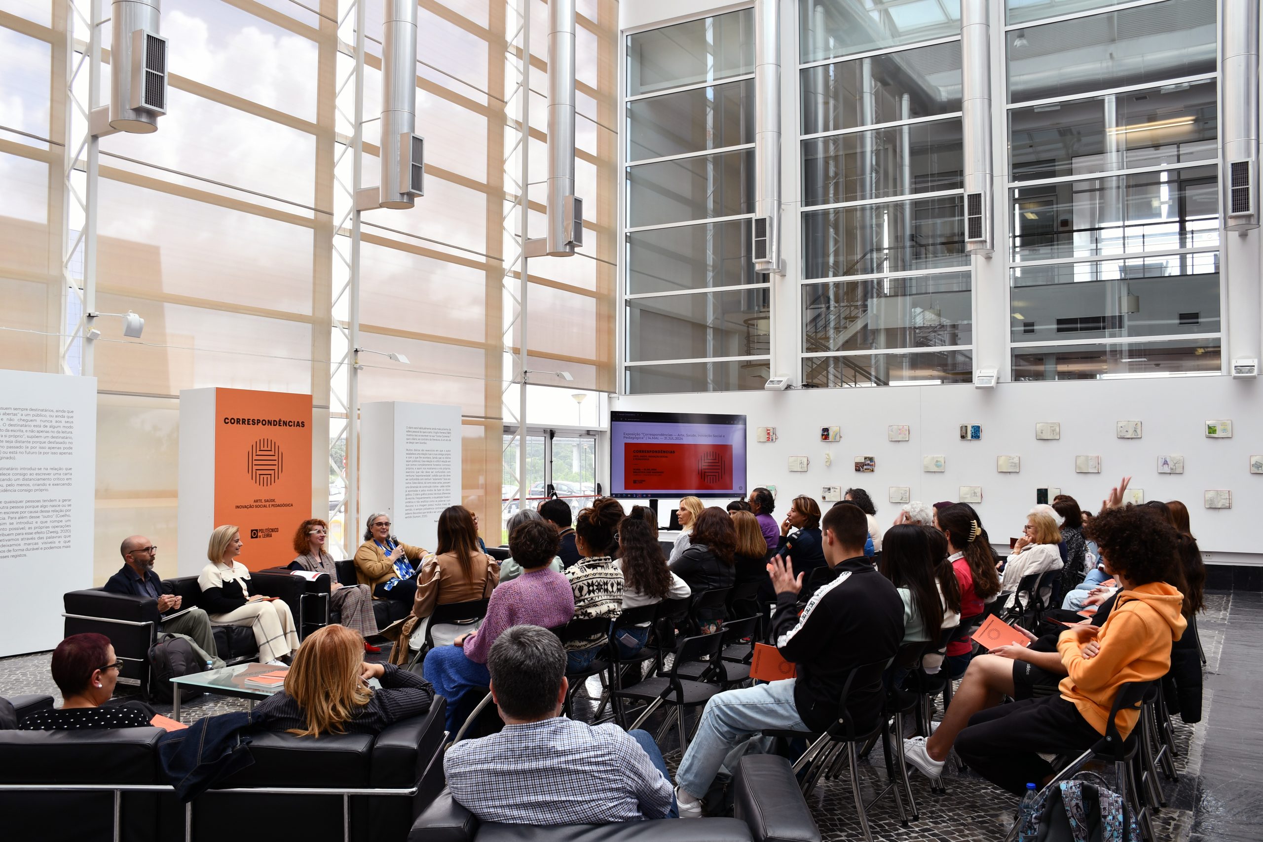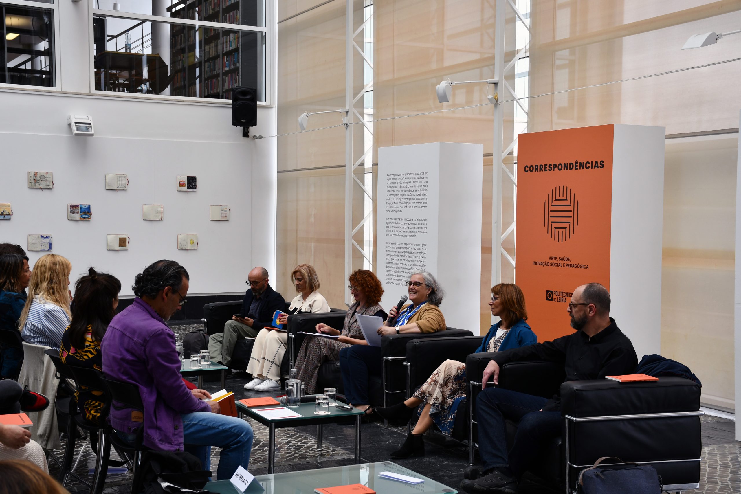 A exposição “Correspondências — Arte, Saúde, Inovação Social e Pedagógica” exibe o cruzamento de dois projetos pedagógicos realizados na ESECS e na ESSLei e a sua conjugação num livro, que apresenta um conjunto de textos produzidos pelos diversos intervenientes e autores convidados, e a sua convergência numa nova leitura/interpretação realizada pelo Professor Fernando Poeiras da ESAD.CR. O Projeto “Correspondências. Cá dentro, Lá fora / Lá dentro, Cá fora: Correspondência de Diários Gráficos” da responsabilidade da Professora Filipa Rodrigues (ESECS /IPLeiria), realizou-se com os estudantes da ESECS, da Escola Secundária Francisco Rodrigues Lobo (ESFRL), de jovens reclusos do Estabelecimento Prisional de Leiria Jovens (EP Leiria Jovens), do Programa 60+ e recentemente da comunidade leiriense através da colaboração com a Biblioteca do Campus 1 (ESECS). O Projeto “Older Self / Younger Self – Cartas do Eu”, da responsabilidade da Professora Sandra Amado (ESSLei/IPLeiria) decorreu com os estudantes de 1.º e 4.º ano do curso de Fisioterapia da ESSLei.